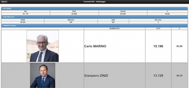 Questi i dati definitivi del ballottaggio di Caserta. Sono andati a votare 29.226 cittadini su 62.692 elettori, pari al 46,62%. Marino ha ottenuto 15.196 preferenze, pari al 53,65%, circa 2000 preferenze 13.129, ovvero il 46,35%. Dati Comune di Caserta