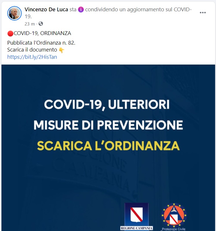 Questo quanto pubblicato sulla pagina facebook del Governatore De Luca