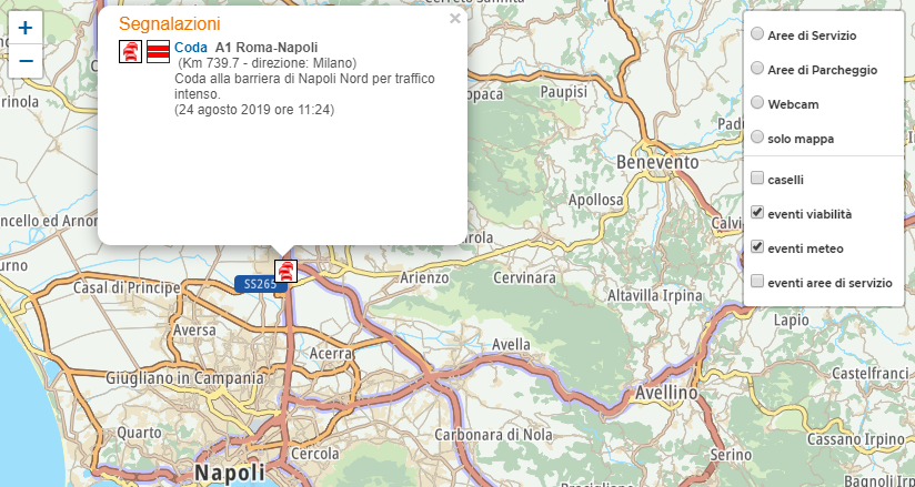 "Coda A1 Roma-Napoli (Km 739.7 - direzione: Milano). Coda alla barriera di Napoli Nord per traffico intenso. (24 agosto 2019 ore 11:24).