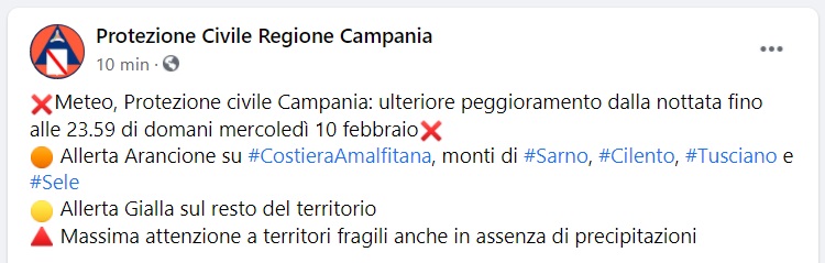 Questo quanto apprendiamo dalla pagina fb della Prot. Civile Campania: "Meteo, Protezione civile Campania: ulteriore peggioramento dalla nottata fino alle 23.59 di domani mercoledì 10 febbraio Allerta Arancione su Costiera Amalfitana, monti di Sarno, Cilento, Tusciano e Sele Allerta Gialla sul resto del territorio Massima attenzione a territori fragili anche in assenza di precipitazioni - si legge nella nota - La perturbazione che sta interessando la nostra regione con piogge e temporali anche forti continuerà ad insistere sulla Campania e subirà un ulteriore peggioramento a partire dalla nottata, quando i modelli matematici evidenziano nuove rilevanti precipitazioni. In considerazione dell'evoluzione del quadro meteorologico e del consistente rischio residuo di frana e caduta massi, reso ancora più elevato dai consistenti fenomeni verificatisi nelle ultime 12 ore proprio nelle zone della regione già interessate da dissesti di varia natura, è stata prorogata di ulteriori 24 ore l'allerta meteo - si legge nella nota -, aumentando il livello di criticità anche per la zona 5 (Tusciano e Alto Sele) che diventa Arancione, come le zone 3,6,8 (Zona 3: Penisola sorrentino-amalfitana, Monti di Sarno e Monti Picentini; Zona 6: Piana Sele e Alto Cilento; Zona 8: Basso Cilento).%u200B Sul resto della regione prorogata l'allerta di colore Giallo. Anche i venti tenderanno ad intensificarsi nuovamente su tutto il territorio nel corso della giornata di domani, mercoledì 10 febbraio Incremento del moto ondoso con possibili mareggiate lungo le coste esposte. Alla attenuazione dei fenomeni prevista per il pomeriggio odierno seguirà dunque una ripresa delle precipitazioni e un incremento dell'intensità dei fenomeni, sia in ordine ai temporali che alla forza del vento e del moto ondoso. Per questo motivo si raccomanda di continuare a porre la massima attenzione anche nelle ore in cui si assiste ad una attenuazione delle precipitazioni: nel bollettino si evidenziano infatti nuovi temporali di forte intensità e venti anche molto forti con raffiche. Mare agitato, con possibili mareggiate lungo le coste esposte. Le precipitazioni riguarderanno dapprima la parte settentrionale della regione - si legge nella nota - per poi estendersi nei quadranti centrali e meridionali della Campania. L'allerta dunque resterà valida fino alle 23.59 di domani, salvo ulteriori proroghe. La Protezione civile della Campania raccomanda agli enti competenti dell'intero territorio regionale (anche dove l'allerta è Gialla) di mantenere in essere tutte le misure atte a prevenire, contrastare e mitigare i fenomeni attesi, anche ampliando la vigilanza rispetto alla corretta tenuta delle strutture esposte alle sollecitazioni dei venti e del moto ondoso. Massima attenzione dovrà essere posta sulle zone 3, 5,6, 8 (Zona 3: Penisola sorrentino-amalfitana, Monti di Sarno e Monti Picentini; Zona 5: Tusciano e Alto Sele; Zona 6: Piana Sele e Alto Cilento; Zona 8: Basso Cilento) dove il livello di criticità idrogeologica è Arancione. Qui si segnala un rischio idrogeologico diffuso anche con fenomeni di Instabilità di versante, localmente anche profonda con possibili frane superficiali e colate rapide di detriti o di fango. Si segnala ancora la necessità di prestare attenzione massima alle aree fragili del territorio e alle zone già colpite dal maltempo degli ultimi giorni - si legge nella nota - nonché di attivare o mantenere attivi i Centri operativi comunali laddove previsto anche in considerazione dell'attuale consistente rischio residuo. Si evidenzia la possibilità di occasionali fenomeni franosi, anche in assenza di precipitazioni, soprattutto nelle aree fragili del territorio o i cui suoli sono saturi a causa delle recenti precipitazioni. La Protezione civile della Regione Campania, attraverso il centro Funzionale e la Sala Operativa, segue l'evolversi dei fenomeni in h24. Queste le specifiche Allerta attualmente in vigore e valida fino alle 23.50 di oggi martedì 9 febbraio %u200B- Sulle zone 3,6,8 (Zona 3: Penisola sorrentino-amalfitana, Monti di Sarno e Monti Picentini; Zona 6: Piana Sele e Alto Cilento; Zona 8: Basso Cilento): Allerta ARANCIONE Temporali anche di forte intensità e precipitazioni diffuse Venti forti con raffiche dai quadranti occidentali Mare agitato Rischio idrogeologico Diffuso Principali scenari di impatto al suolo: Instabilità di versante, localmente anche profonda, frane superficiali e colate rapide di detriti o di fango - si legge nella nota -; Significativi ruscellamenti superficiali, anche con trasporto di materiale, possibili voragini per fenomeni di erosione; Allagamenti di locali interrati e di quelli a pian terreno; Innalzamento dei livelli idrometrici dei corsi d’acqua, con fenomeni di inondazione delle aree limitrofe, anche per effetto di criticità locali (tratti tombati, restringimenti, occlusioni delle luci dei ponti); Scorrimento superficiale delle acque nelle strade e possibili fenomeni di rigurgito delle acque piovane con tracimazione e coinvolgimento delle aree urbane depresse; Occasionali fenomeni franosi e possibili cadute massi per condizioni idrogeologiche particolarmente fragili, per la saturazione dei suoli. - %u200B%u200BSulle zone 1,2,4,5,7 (Zona 1: Piana campana, Napoli, Isole, Area Vesuviana; Zona 2: Alto Volturno e Matese; Zona 4: Alta Irpinia e Sannio; Zona 5: Tusciano e Alto Sele; Zona 7: Tanagro) Allerta GIALLA Precipitazioni sparse e temporali localmente anche intensi Venti forti con raffiche dai quadranti occidentali Mare agitato Rischio idrogeologico Localizzato Principali scenari di impatto al suolo - si legge nella nota -: Ruscellamenti superficiali con possibili fenomeni di trasporto di materiale; Possibili allagamenti di locali interrati e di quelli a pian terreno; Scorrimento superficiale delle acque nelle sedi stradali, possibili fenomeni di rigurgito dei sistemi di smaltimento delle acque meteoriche con tracimazione e coinvolgimento delle aree depresse; I