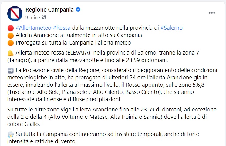 Questo quanto pubblicato sulla pagina facebook della Regione Campania