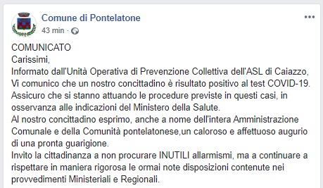 Questo quanto comunicato dalla pagina fb del Comune di Pontelatone