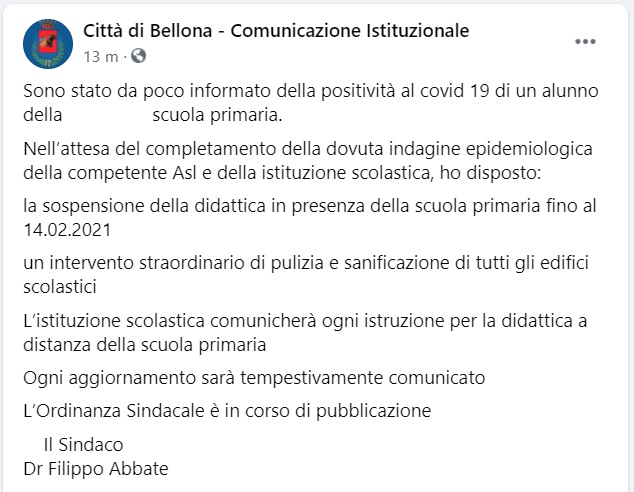 Questo quanto apprendiamo dalla pagina fb del Comune di Bellona: "Sono stato da poco informato della positività al covid 19 di un alunno della ... scuola primaria. Nell’attesa del completamento della dovuta indagine epidemiologica - si legge nella nota - della competente Asl e della istituzione scolastica, ho disposto: la sospensione della didattica in presenza della scuola primaria fino al 14.02.2021, un intervento straordinario di pulizia e sanificazione di tutti gli edifici scolastici. L’istituzione scolastica - si legge nella nota - comunicherà ogni istruzione per la didattica a distanza della scuola primaria Ogni aggiornamento sarà tempestivamente comunicato L’Ordinanza Sindacale è in corso di pubblicazione Il Sindaco Dr Filippo Abbate".