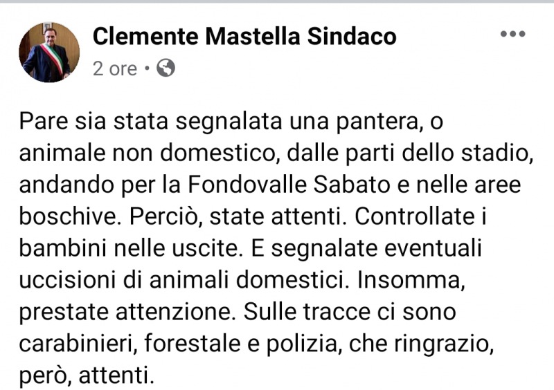 "Pare sia stata segnalata una pantera, o animale non domestico, dalle parti dello stadio, andando per la Fondovalle Sabato e nelle aree boschive. Perciò, state attenti. Controllate i bambini nelle uscite. E segnalate eventuali uccisioni di animali domestici. Insomma, prestate attenzione. Sulle tracce ci sono carabinieri, forestale e polizia, che ringrazio, però, attenti."