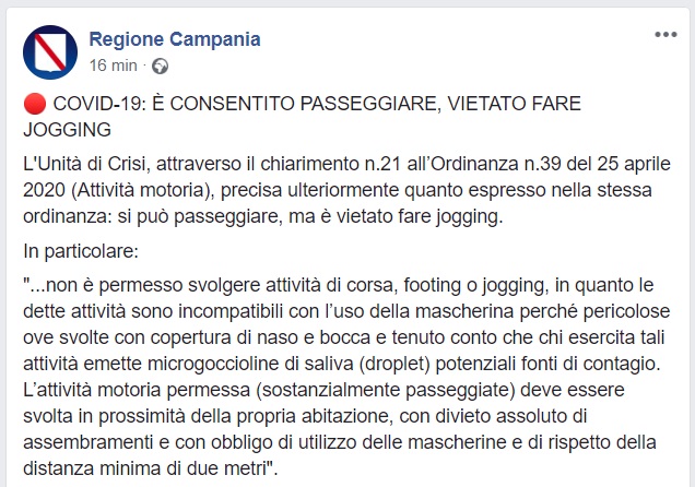 ULTIM'ORA. Campania. "Vietato fare jogging, consentito passeggiare"