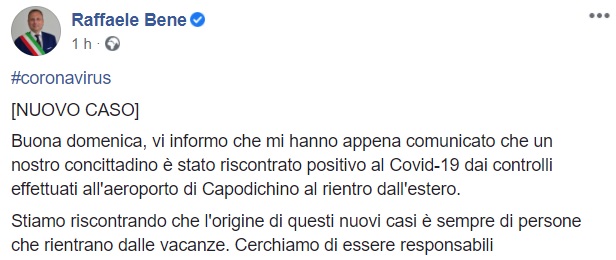 Questo quanto apprendiamo dalla pagina facebook del Sindaco Bene: