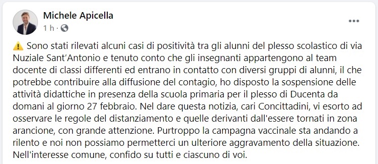 Questo quanto pubblicato sulla pagina facebook del Sindaco Michele Apicella di Trentola-Ducenta: "Sono stati rilevati alcuni casi di positività tra gli alunni del plesso scolastico di via Nuziale Sant’Antonio e tenuto conto che gli insegnanti appartengono al team docente di classi differenti - si legge nella nota - ed entrano in contatto con diversi gruppi di alunni, il che potrebbe contribuire alla diffusione del contagio, ho disposto la sospensione delle attività didattiche in presenza della scuola primaria per il plesso di Ducenta da domani al giorno 27 febbraio. Nel dare questa notizia - si legge nella nota -, cari Concittadini, vi esorto ad osservare le regole del distanziamento e quelle derivanti dall'essere tornati in zona arancione, con grande attenzione. Purtroppo la campagna vaccinale sta andando a rilento e noi non possiamo permetterci un ulteriore aggravamento della situazione. Nell'interesse comune, confido su tutti e ciascuno di voi."