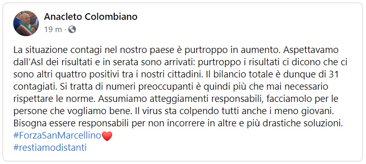 Questo quanto comunicato dal Sindaco di San Marcellino