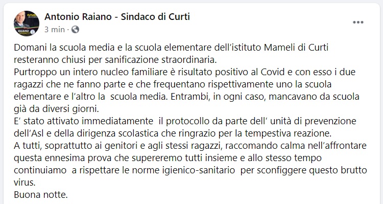 Questo quanto pubblicato sulla pagina fb del Sindaco di Curti