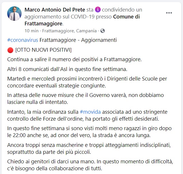 Questo quanto comunicato dal Sindaco di Frattamaggiore