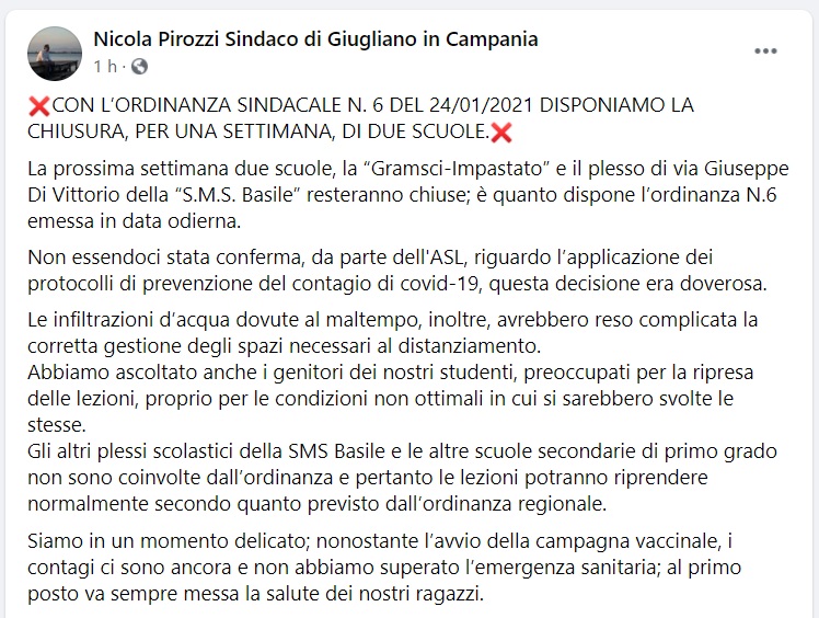 Questo quanto apprendiamo dalla pagina facebook del Sindaco di Giugliano: "CON L’ORDINANZA SINDACALE N. 6 DEL 24/01/2021 DISPONIAMO LA CHIUSURA, PER UNA SETTIMANA, DI DUE SCUOLE. La prossima settimana due scuole, la “Gramsci-Impastato” e il plesso di via Giuseppe Di Vittorio della “S.M.S. Basile” - si legge nella nota - resteranno chiuse; è quanto dispone l’ordinanza N.6 emessa in data odierna. Non essendoci stata conferma, da parte dell'ASL, riguardo l’applicazione dei protocolli di prevenzione del contagio di covid-19, questa decisione era doverosa. Le infiltrazioni d’acqua dovute al maltempo, inoltre, avrebbero reso complicata la corretta gestione degli spazi necessari al distanziamento. Abbiamo - si legge nella nota - ascoltato anche i genitori dei nostri studenti, preoccupati per la ripresa delle lezioni, proprio per le condizioni non ottimali in cui si sarebbero svolte le stesse. Gli altri plessi scolastici della SMS Basile e le altre scuole secondarie di primo grado non sono coinvolte dall’ordinanza e pertanto le lezioni potranno riprendere normalmente secondo quanto previsto dall’ordinanza regionale. Siamo in un momento delicato; nonostante l’avvio della campagna vaccinale - si legge nella nota -, i contagi ci sono ancora e non abbiamo superato l’emergenza sanitaria; al primo posto va sempre messa la salute dei nostri ragazzi."