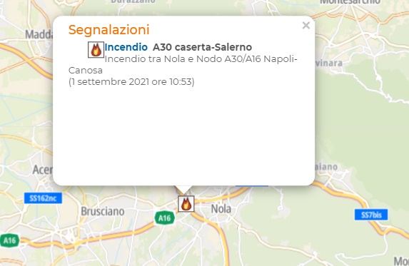 Questo quanto apprendiamo da Autostrade: "A30CASERTA-SALERNO Incendio NOLA - Incendio Incendio tra Nola e Nodo A30/A16 Napoli-Canosa (1 settembre 2021 ore 10:53)"