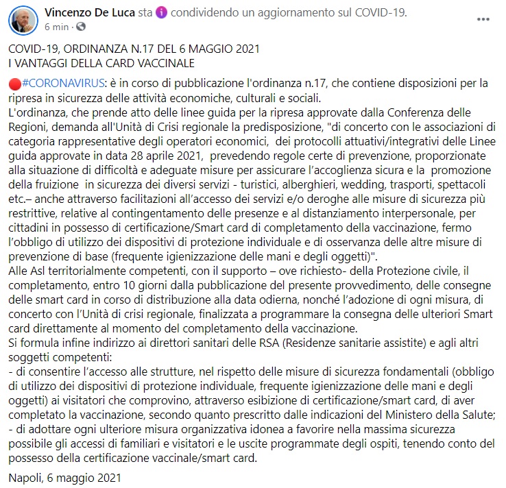 Questo quanto apprendiamo dalla pagina fb del Pres. De Luca: "COVID-19, ORDINANZA N.17 DEL 6 MAGGIO 2021 I VANTAGGI DELLA CARD VACCINALE CORONAVIRUS: è in corso di pubblicazione l'ordinanza n.17, che contiene disposizioni per la ripresa in sicurezza delle attività economiche, culturali e sociali. L'ordinanza, che prende atto delle linee guida per la ripresa approvate dalla Conferenza delle Regioni - si legge nella nota -, demanda all'Unità di Crisi regionale la predisposizione, "di concerto con le associazioni di categoria rappresentative degli operatori economici, dei protocolli attuativi/integrativi delle Linee guida approvate in data 28 aprile 2021, prevedendo regole certe di prevenzione, proporzionate alla situazione di difficoltà e adeguate misure per assicurare l’accoglienza sicura e la promozione della fruizione in sicurezza dei diversi servizi - turistici, alberghieri, wedding, trasporti, spettacoli etc.– anche attraverso facilitazioni all’accesso dei servizi e/o deroghe alle misure di sicurezza più restrittive, relative al contingentamento delle presenze e al distanziamento interpersonale - si legge nella nota -, per cittadini in possesso di certificazione/Smart card di completamento della vaccinazione, fermo l’obbligo di utilizzo dei dispositivi di protezione individuale e di osservanza delle altre misure di prevenzione di base (frequente igienizzazione delle mani e degli oggetti)". Alle Asl territorialmente competenti, con il supporto – ove richiesto- della Protezione civile, il completamento, entro 10 giorni dalla pubblicazione del presente provvedimento, delle consegne delle smart card in corso di distribuzione alla data odierna, nonché l’adozione di ogni misura, di concerto con l’Unità di crisi regionale, finalizzata a programmare la consegna delle ulteriori Smart card direttamente al momento del completamento della vaccinazione. Si formula infine indirizzo ai direttori sanitari delle RSA (Residenze sanitarie assistite) e agli altri soggetti competenti: - di consentire l’accesso alle strutture, nel rispetto delle misure di sicurezza fondamentali (obbligo di utilizzo dei dispositivi di protezione individuale, frequente igienizzazione delle mani e degli oggetti) ai visitatori che comprovino, attraverso esibizione di certificazione/smart card, di aver completato la vaccinazione, secondo quanto prescritto dalle indicazioni del Ministero della Salute - si legge nella nota -; - di adottare ogni ulteriore misura organizzativa idonea a favorire nella massima sicurezza possibile gli accessi di familiari e visitatori e le uscite programmate degli ospiti, tenendo conto del possesso della certificazione vaccinale/smart card."