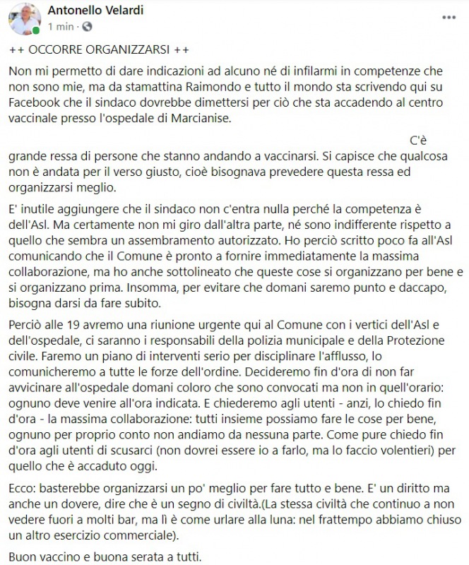 Questo quanto pubblicato sulla pagina fb del Sindaco Velardi: "OCCORRE ORGANIZZARSI Non mi permetto di dare indicazioni ad alcuno né di infilarmi in competenze che non sono mie, ma da stamattina Raimondo e tutto il mondo sta scrivendo qui su Facebook che il sindaco dovrebbe dimettersi - si legge nella nota - per ciò che sta accadendo al centro vaccinale presso l'ospedale di Marcianise. ... . C'è grande ressa di persone che stanno andando a vaccinarsi. Si capisce che qualcosa non è andata per il verso giusto, cioè bisognava prevedere questa ressa ed organizzarsi meglio. E' inutile aggiungere che il sindaco non c'entra nulla perché la competenza è dell'Asl. Ma certamente non mi giro dall'altra parte, né sono indifferente rispetto a quello che sembra un assembramento autorizzato. Ho perciò scritto poco fa all'Asl comunicando che il Comune è pronto a fornire immediatamente la massima collaborazione - si legge nella nota -, ma ho anche sottolineato che queste cose si organizzano per bene e si organizzano prima. Insomma, per evitare che domani saremo punto e daccapo, bisogna darsi da fare subito. Perciò alle 19 avremo una riunione urgente qui al Comune con i vertici dell'Asl e dell'ospedale, ci saranno i responsabili della polizia municipale e della Protezione civile. Faremo un piano di interventi serio per disciplinare l'afflusso, lo comunicheremo a tutte le forze dell'ordine. Decideremo fin d'ora di non far avvicinare all'ospedale domani coloro che sono convocati ma non in quell'orario: ognuno deve venire all'ora indicata. E chiederemo agli utenti - anzi, lo chiedo fin d'ora - la massima collaborazione: tutti insieme possiamo fare le cose per bene, ognuno per proprio conto - si legge nella nota - non andiamo da nessuna parte. Come pure chiedo fin d'ora agli utenti di scusarci (non dovrei essere io a farlo, ma lo faccio volentieri) per quello che è accaduto oggi. Ecco: basterebbe organizzarsi un po' meglio per fare tutto e bene. E' un diritto ma anche un dovere, dire che è un segno di civiltà. (La stessa civiltà che continuo a non vedere fuori a molti bar, ma lì è come urlare alla luna: nel frattempo abbiamo chiuso un altro esercizio commerciale). - si legge nella nota - Buon vaccino e buona serata a tutti."