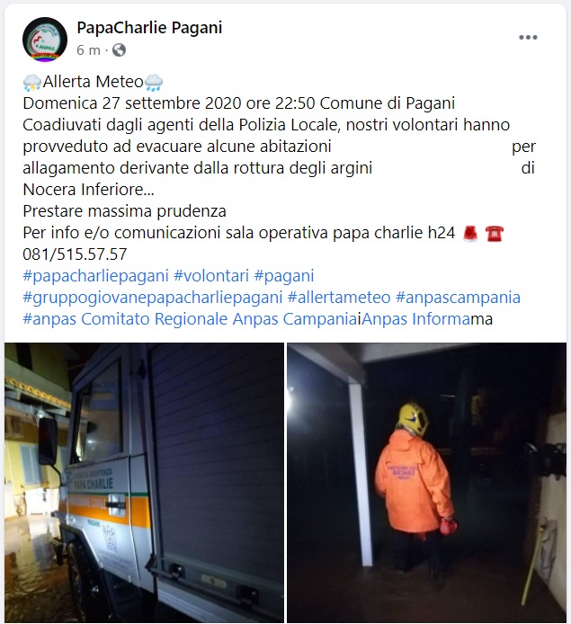 Questo quanto pubblicato dalla pagina della Prot. Civile Papa Charlie di Pagani