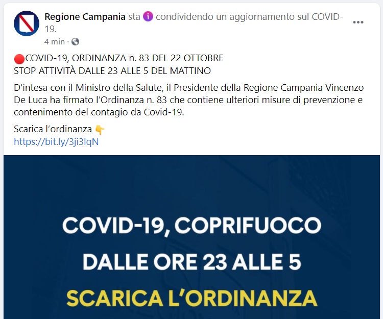 Questo quanto pubblicato sulla pagina FB della Regione Campania