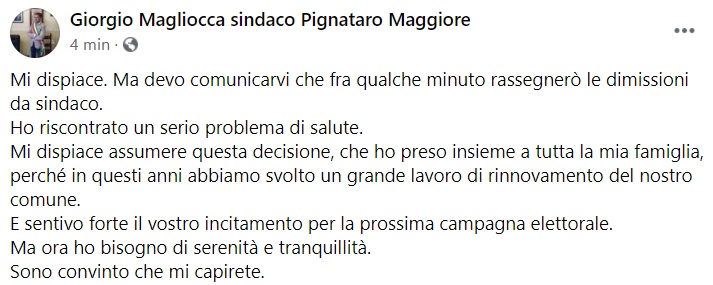 "Mi dispiace. Ma devo comunicarvi che fra qualche minuto rassegnerò le dimissioni da sindaco. Ho riscontrato un serio problema di salute. Mi dispiace assumere questa decisione, che ho preso insieme a tutta la mia famiglia, perché- si legge nella nota- in questi anni abbiamo svolto un grande lavoro di rinnovamento del nostro comune. E sentivo forte il vostro incitamento per la prossima campagna elettorale. Ma ora ho bisogno di serenità e tranquillità. Sono convinto che mi capirete."