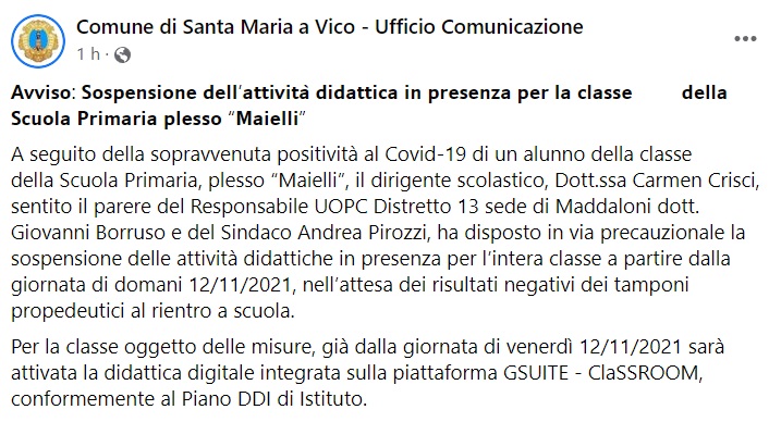 Questo quanto apprendiamo dalla pagina facebook del Comune di Santa Maria a Vico: "Avviso: Sospensione dell'attività didattica in presenza per la classe ... della Scuola Primaria plesso 'Maielli'. A seguito della sopravvenuta positività al Covid-19 di un alunno della classe ... della Scuola Primaria, plesso “Maielli” - si legge nella nota -, il dirigente scolastico, Dott.ssa Carmen Crisci, sentito il parere del Responsabile UOPC Distretto 13 sede di Maddaloni dott. Giovanni Borruso e del Sindaco Andrea Pirozzi, ha disposto in via precauzionale la sospensione delle attività didattiche in presenza per l’intera classe a partire dalla giornata di domani 12/11/2021, nell’attesa dei risultati negativi dei tamponi propedeutici al rientro a scuola. Per la classe oggetto delle misure, già dalla giornata di venerdì 12/11/2021 - si legge nella nota - sarà attivata la didattica digitale integrata sulla piattaforma GSUITE - ClaSSROOM, conformemente al Piano DDI di Istituto."