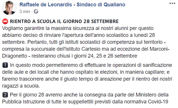 Questo quanto apprendiamo dalla pagina facebook del Sindaco de Leonardis: