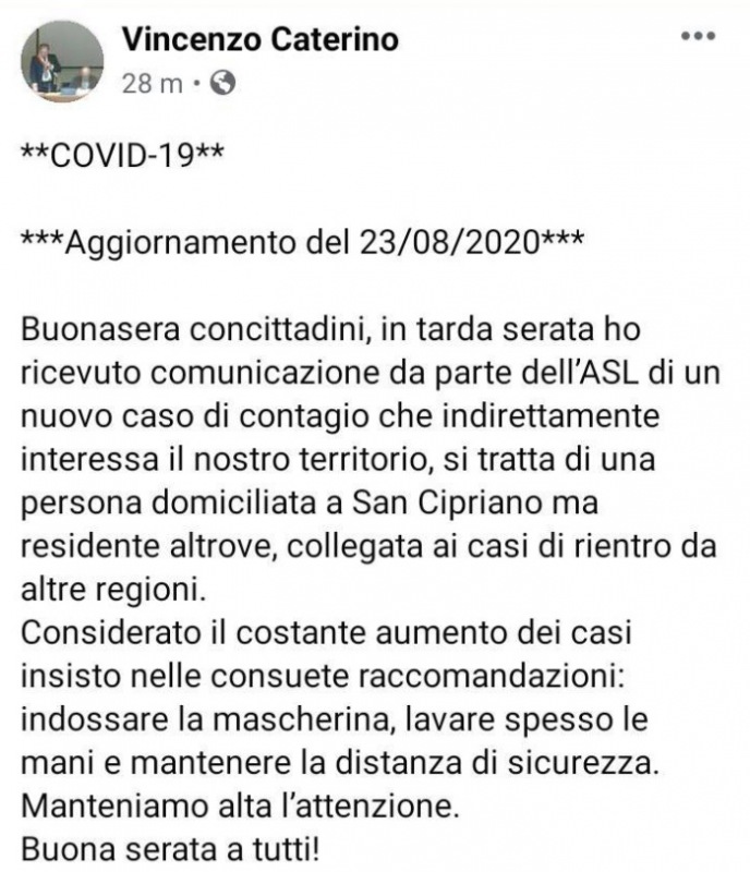 Questo quanto pubblicato sulla pagina facebook del Sindaco Caterino: