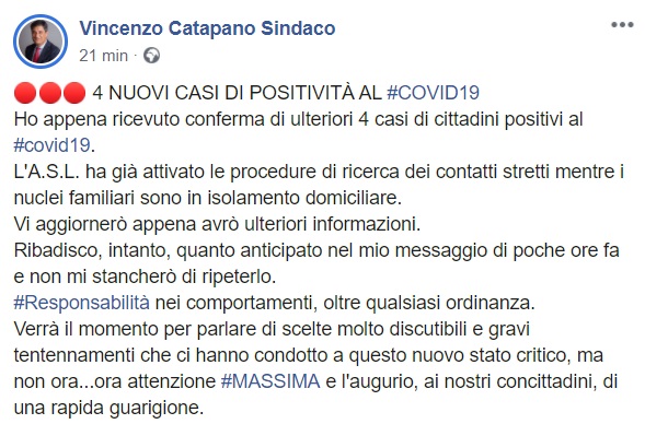 Questo quanto pubblicato sulla pagina facebook del Sindaco Catapano: