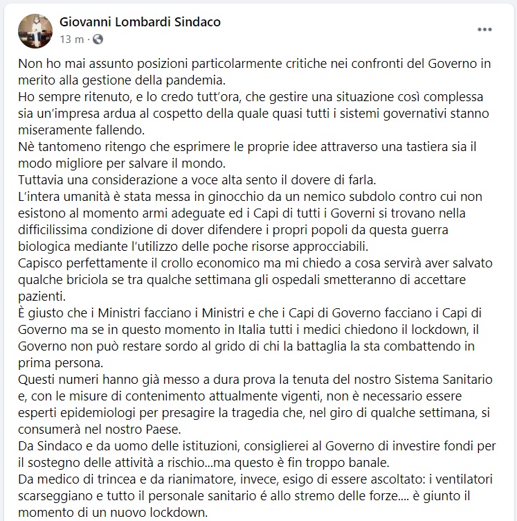 Questo quanto pubblicato sulla sua pagina facebook dal Sindaco di Calvi Risorta Giovanni Lomabrdi