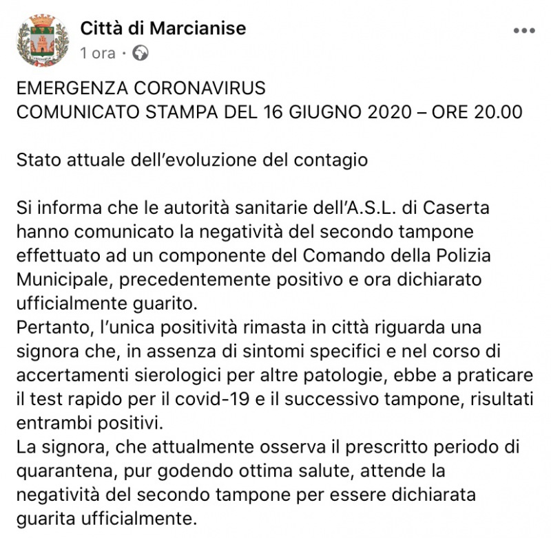 Questo quanto comunicato dal Comune di Marcianise