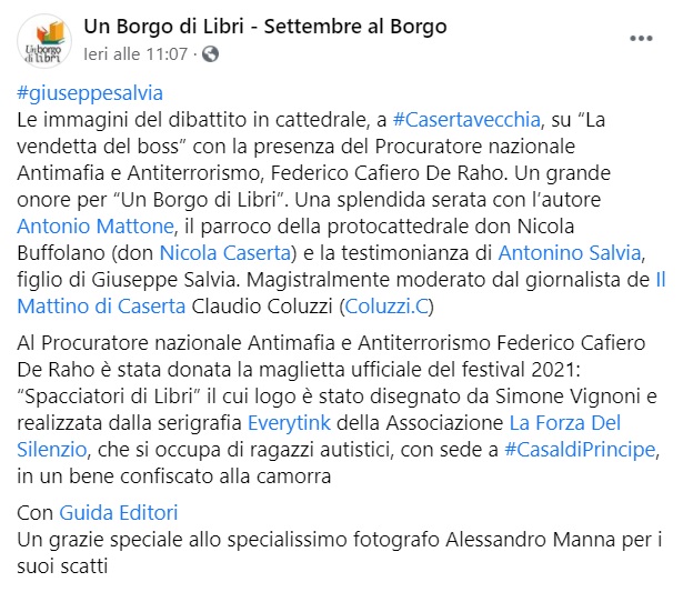 "Le immagini del dibattito in cattedrale, a #Casertavecchia, su “La vendetta del boss” con la presenza del Procuratore nazionale Antimafia e Antiterrorismo, Federico Cafiero De Raho. Un grande onore per “Un Borgo di Libri”. -Si legge nella nota- Una splendida serata con l’autore Antonio Mattone, il parroco della protocattedrale don Nicola Buffolano (don Nicola Caserta) e la testimonianza di Antonino Salvia, figlio di Giuseppe Salvia. Magistralmente moderato dal giornalista de Il Mattino di Caserta Claudio Coluzzi (Coluzzi.C) Al Procuratore nazionale Antimafia e Antiterrorismo Federico Cafiero De Raho è stata donata la maglietta ufficiale del festival 2021: -Si legge nella nota- “Spacciatori di Libri” il cui logo è stato disegnato da Simone Vignoni e realizzata dalla serigrafia Everytink della Associazione La Forza Del Silenzio, che si occupa di ragazzi autistici, con sede a #CasaldiPrincipe, in un bene confiscato alla camorra Con Guida Editori Un grazie speciale allo specialissimo fotografo Alessandro Manna per i suoi scatti"
