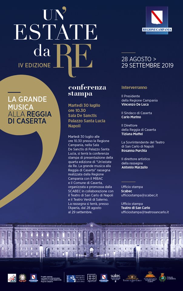 "Convocata a Napoli una conferenza stampa per presentare la quarta edizione di "Un'Estate da Re". Martedì 30 luglio, alle ore 10:30, nella sala De Sanctis del Palazzo Santa Lucia di Napoli, si terrà la conferenza stampa di presentazione della IV edizione di "Un'Estate da Re". Interverrano, tra gli altri, anche il Presidente della Regione Campania, Vincenzo De Luca, e il Sindaco di Caserta, Carlo Marino."