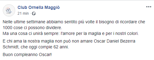 "Nelle ultime settimane abbiamo sentito più volte il bisogno di ricordare che 1000 cose ci possono dividere. Ma una cosa ci unirà sempre: l'amore per la maglia e per i nostri colori. E chi ama la nostra maglia non può non amare Oscar Daniel Bezerra Schmidt, che oggi compie 62 anni. Buon compleanno Oscar!"