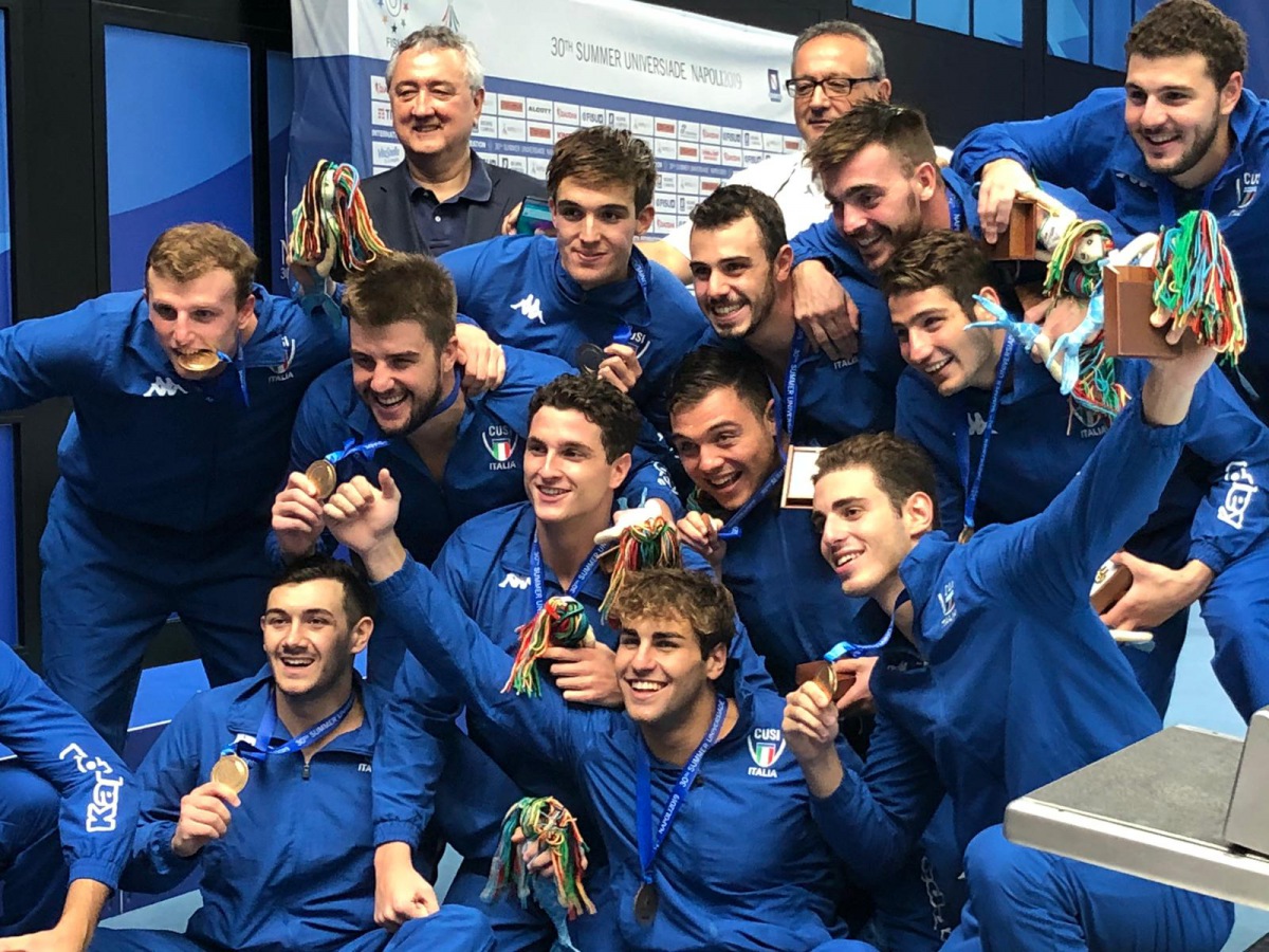 "È il tricolore l’ultima bandiera a sventolare sul pennone della 30^ Summer Universiade Napoli 2019. L’ultima delle 220 medaglie d’oro assegnate ai Giochi di Napoli la conquista con merito l’Italia della pallanuoto maschile che alla Scandone, alla presenza di 4mila spettatori, batte l’USA per 18 a 7 suggellando un torneo perfetto ed un’edizione delle Universiadi che entra di diritto nella Hall of Fame dello sport italiano grazie al record di medaglie (44) ottenuto. Si legge nel comunicato. Che sarà una giornata speciale lo si comprende fin dal principio. L’onda tricolore parte dalle tribune della Piscina Scandone e si propaga fin dentro l’acqua; il team a “Stelle e Strisce” ne è travolto mentre il Settebello surfa che è un piacere. Trascorrono 20 secondi e Alesiani rompe il ghiaccio, lo seguono Bruni e Campopiano. Si legge nel comunicato. Gli USA trovano il primo gol quando mancano 90 secondi al termine del primo periodo ma è una gioia fugace perché sul ribaltamento Panerai ristabilisce le distanze. Brivido in apertura del secondo periodo. Gli statunitensi accorciano le distanze trovando due gol nel giro di due minuti. Reagisce la Scandone le fa eco il Settebello. È uno dei quattro napoletani in vasca, Del Basso, a scuotere gli Azzurri, lo seguono Cannella e Guidi. Si legge nel comunicato. Si va al cambio vasca con un rassicurante + 4 (7-3). Il terzo periodo è praticamente senza storia, di fatto è quello che regala la medaglia d’oro della 30^ Summer Universiade Napoli 2019 all’Italia di Angelini. Pellegrini è un muro invalicabile, Esposito, Cannella e Campopiano due volte ne valorizzano le qualità andando a segno con puntualità disarmante. Si legge nel comunicato. Forte di un vantaggio di sei reti l’Italia si concede un quarto ed ultimo periodo di assoluto relax, una lunga e piacevolissima passerella in attesa della serena. Si legge nel comunicato. Il Settedoro di Angelini, sotto lo sguardo attento e soddisfatto del Presidente della FIN Barelli e del Commissario Straordinario di Napoli 2019 Gianluca Basile, regala gol e spettacolo andando a segno a ripetizione con Cannella, Guidi, Alesiani, Panerai, Novara (2) e Campopiano (2) tenendo botta anche sull’ultimo sussulto d’orgoglio della nazionale; inimmaginabile non chiudere la bellissima favola della Scandone a Napoli 2019 con un tuffo nell’oro."