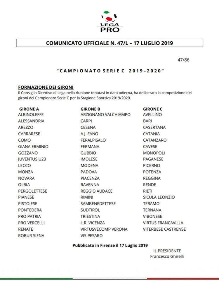 "ECCO I GIRONI DI SERIE C. In quello dei falchetti le novità Avellino, Bari, Picerno, Teramo e Ternana."