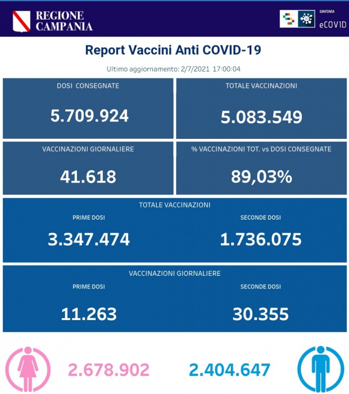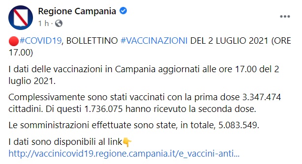"#COVID19, BOLLETTINO #VACCINAZIONI DEL 2 LUGLIO 2021 (ORE 17.00) I dati delle vaccinazioni in Campania aggiornati alle ore 17.00 del 2 luglio 2021. Complessivamente sono stati vaccinati con la prima dose 3.347.474 cittadini. Di questi 1.736.075 hanno ricevuto la seconda dose. Le somministrazioni effettuate sono state, in totale, 5.083.549. I dati sono disponibili al link http://vaccinicovid19.regione.campania.it/e_vaccini-anti..."