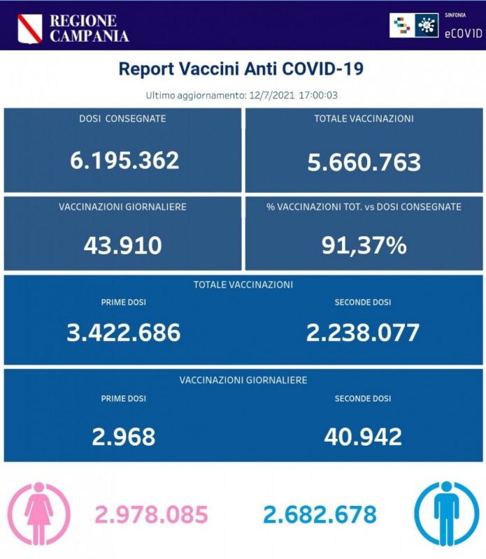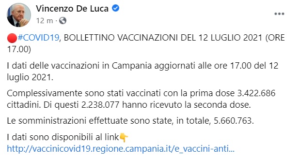 "I dati delle vaccinazioni in Campania aggiornati alle ore 17.00 del 12 luglio 2021. Complessivamente sono stati vaccinati con la prima dose 3.422.686 cittadini. Di questi 2.238.077 hanno ricevuto la seconda dose. Le somministrazioni effettuate sono state, in totale, 5.660.763. I dati sono disponibili al link http://vaccinicovid19.regione.campania.it/e_vaccini-anti..."