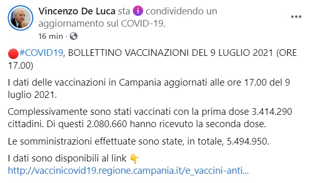 Questo quanto pubblicato sulla pagina facebook del Pres. De Luca: