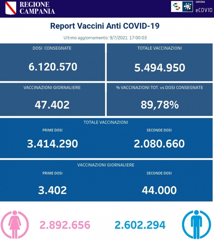 "I dati delle vaccinazioni in Campania aggiornati alle ore 17.00 del 9 luglio 2021. Complessivamente sono stati vaccinati con la prima dose 3.414.290 cittadini. Di questi 2.080.660 hanno ricevuto la seconda dose. -Si legge nella nota- Le somministrazioni effettuate sono state, in totale, 5.494.950. I dati sono disponibili al link http://vaccinicovid19.regione.campania.it/e_vaccini-anti..."