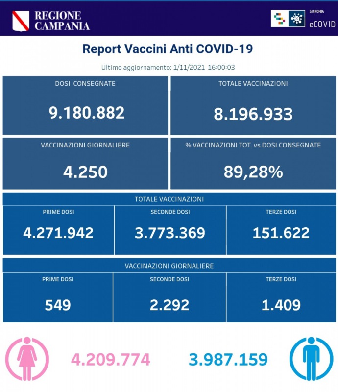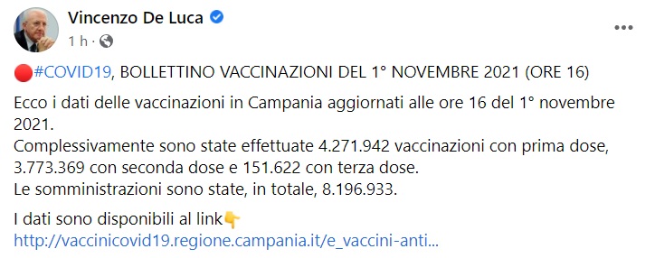 "Ecco i dati delle vaccinazioni in Campania aggiornati alle ore 16 del 1° novembre 2021. Complessivamente sono state effettuate 4.271.942 vaccinazioni con prima dose, 3.773.369 con seconda dose e 151.622 con terza dose. Le somministrazioni sono state, in totale, 8.196.933. I dati sono disponibili al link http://vaccinicovid19.regione.campania.it/e_vaccini-anti..."