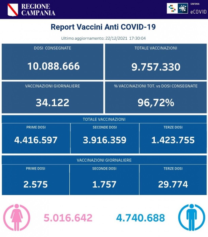 "Ecco i dati delle vaccinazioni in Campania aggiornati alle ore 17.30 del 22 dicembre 2021. Complessivamente sono state effettuate 4.416.597 vaccinazioni con prima dose, 3.916.359 con seconda dose e 1.423.755 con terza dose. -Si legge nella nota- Le somministrazioni sono state, in totale, 9.757.330. I dati sono disponibili al link: http://vaccinicovid19.regione.campania.it/e_vaccini-anti..."