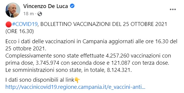 Questo quanto pubblicato sulla pagina facebook del Pres. De Luca: