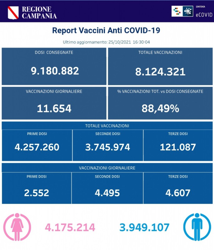 "Ecco i dati delle vaccinazioni in Campania aggiornati alle ore 16.30 del 25 ottobre 2021. Complessivamente sono state effettuate 4.257.260 vaccinazioni con prima dose, 3.745.974 con seconda dose e 121.087 con terza dose. Le somministrazioni sono state, in totale, 8.124.321. I dati sono disponibili al link http://vaccinicovid19.regione.campania.it/e_vaccini-anti..."