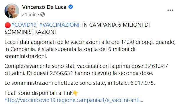 Questo quanto pubblicato sulla pagina facebook del Pres. De Luca: