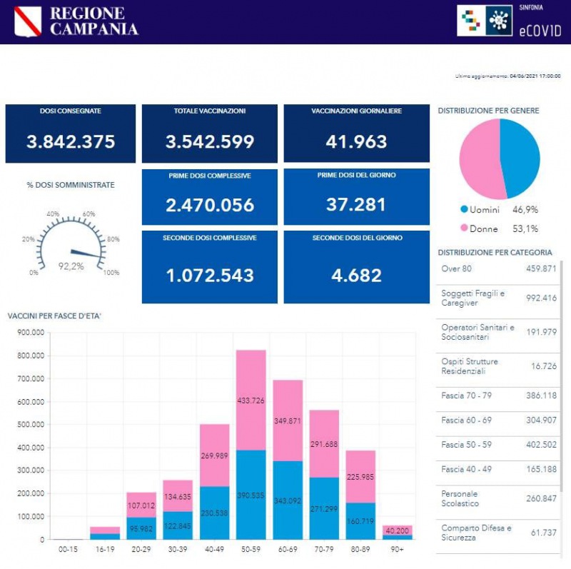 "I dati delle vaccinazioni in Campania aggiornati alle ore 17.00 del 4 giugno 2021. Complessivamente sono stati vaccinati con la prima dose 2.470.056 cittadini. Di questi 1.072.543 hanno ricevuto la seconda dose. Le somministrazioni effettuate sono state, in totale, 3.542.599. I dati sono disponibili al link http://vaccinicovid19.regione.campania.it/e_vaccini-anti..."