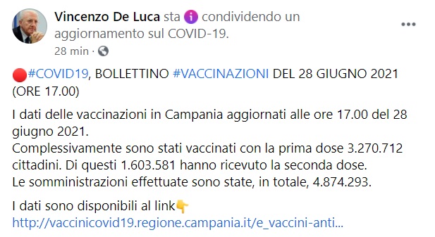 "I dati delle vaccinazioni in Campania aggiornati alle ore 17.00 del 28 giugno 2021. Complessivamente sono stati vaccinati con la prima dose 3.270.712 cittadini. Di questi 1.603.581 hanno ricevuto la seconda dose. Le somministrazioni effettuate sono state, in totale, 4.874.293. I dati sono disponibili al link http://vaccinicovid19.regione.campania.it/e_vaccini-anti..."