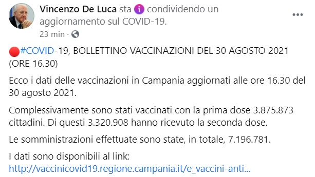 "Ecco i dati delle vaccinazioni in Campania aggiornati alle ore 16.30 del 30 agosto 2021. Complessivamente sono stati vaccinati con la prima dose 3.875.873 cittadini. Di questi 3.320.908 hanno ricevuto la seconda dose. Le somministrazioni effettuate sono state, in totale, 7.196.781. I dati sono disponibili al link: http://vaccinicovid19.regione.campania.it/e_vaccini-anti..."