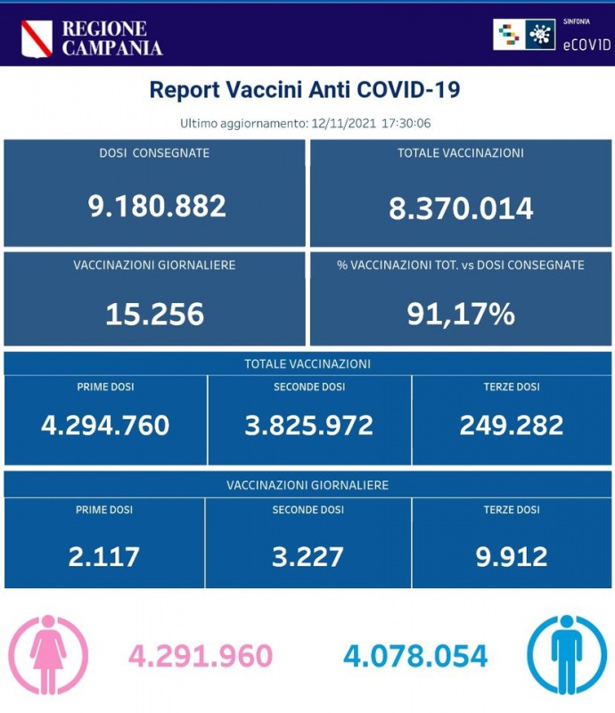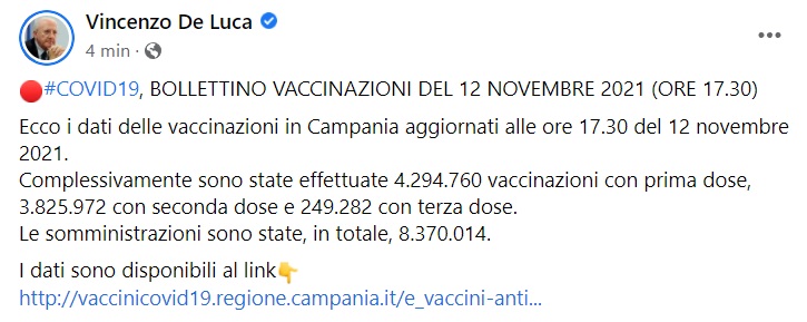 "Ecco i dati delle vaccinazioni in Campania aggiornati alle ore 17.30 del 12 novembre 2021. Complessivamente sono state effettuate 4.294.760 vaccinazioni con prima dose, 3.825.972 con seconda dose e 249.282 con terza dose. -Si legge nella nota- Le somministrazioni sono state, in totale, 8.370.014. I dati sono disponibili al link http://vaccinicovid19.regione.campania.it/e_vaccini-anti..."