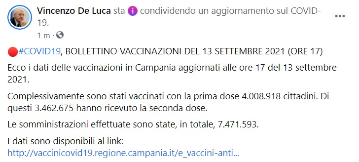 Questo quanto pubblicato sulla pagina facebook del Pres. De Luca: