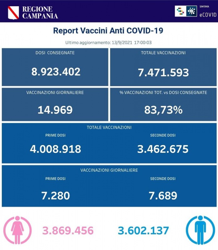 "#COVID19, BOLLETTINO VACCINAZIONI DEL 13 SETTEMBRE 2021 (ORE 17) Ecco i dati delle vaccinazioni in Campania aggiornati alle ore 17 del 13 settembre 2021. Complessivamente sono stati vaccinati con la prima dose 4.008.918 cittadini. Di questi 3.462.675 hanno ricevuto la seconda dose. Le somministrazioni effettuate sono state, in totale, 7.471.593. I dati sono disponibili al link: http://vaccinicovid19.regione.campania.it/e_vaccini-anti..."