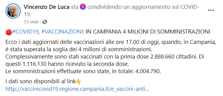 Questo quanto pubblicato sulla pagina facebook del Pres. De Luca: