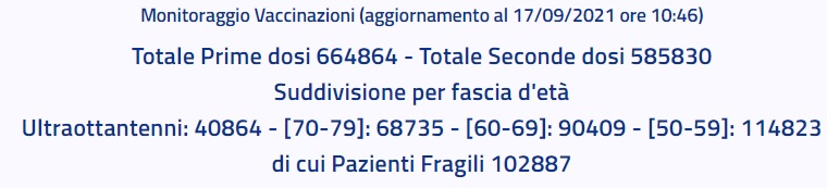 Questo quanto apprendiamo dall'ASL CE: Monitoraggio Vaccinazioni (aggiornamento al 17/09/2021 ore 10:46) Totale Prime dosi 664864 - Totale Seconde dosi 585830 Suddivisione per fascia d'età Ultraottantenni: 40864 - [70-79]: 68735 - [60-69]: 90409 - [50-59]: 114823 di cui Pazienti Fragili 102887"