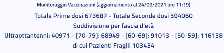 Questo quanto apprendiamo dall'ASL CE: "Monitoraggio Vaccinazioni (aggiornamento al 24/09/2021 ore 11:19) Totale Prime dosi 673687 - Totale Seconde dosi 594060 Suddivisione per fascia d'età Ultraottantenni: 40971 - [70-79]: 68949 - [60-69]: 91013 - [50-59]: 116138 di cui Pazienti Fragili 103434"